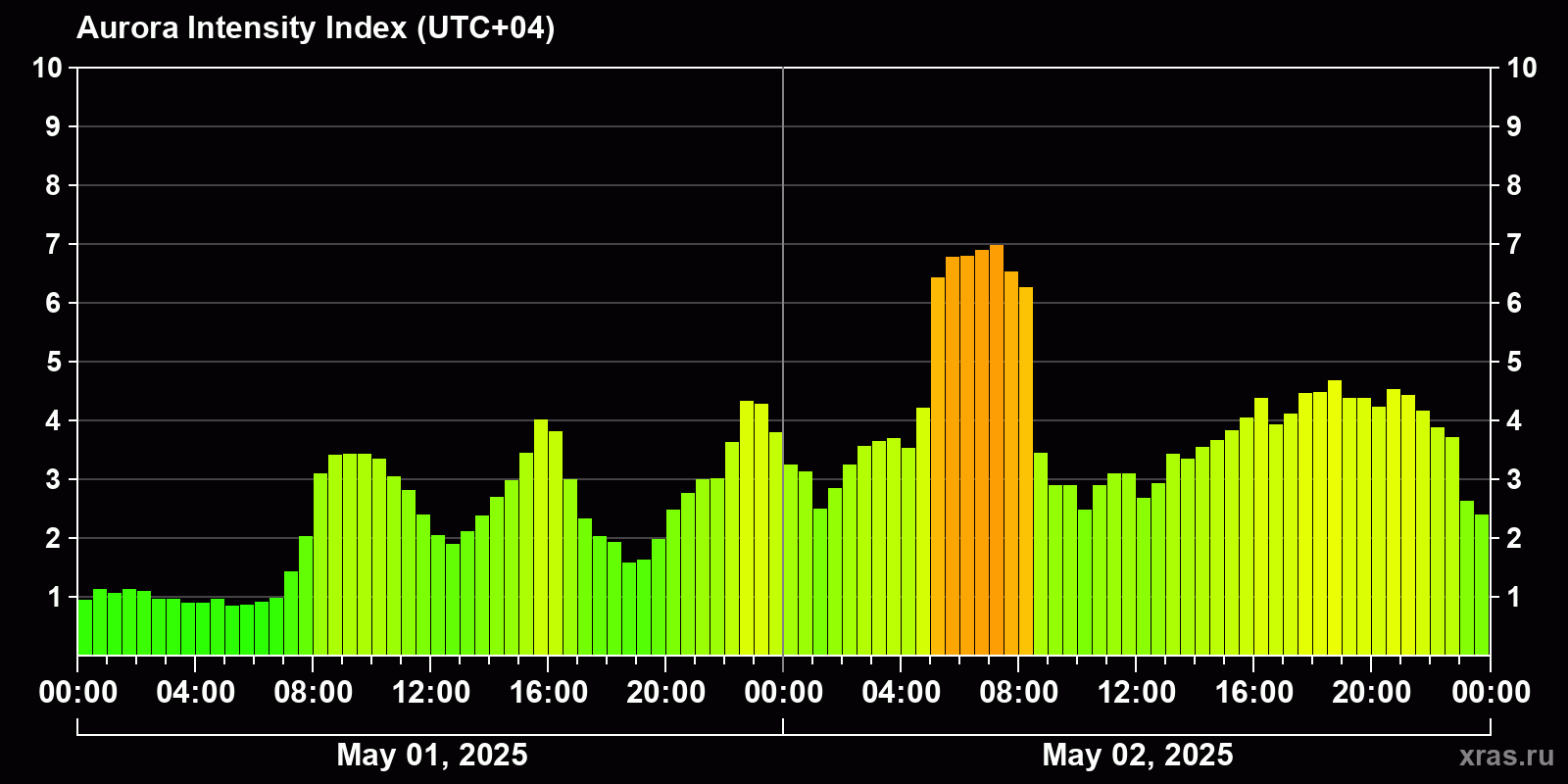 Auroral intensity index and the theoretically possible latitude of observations for nighttime in the Estern Hemisphere as of 2025-05-02 23:45 (end of day) local time