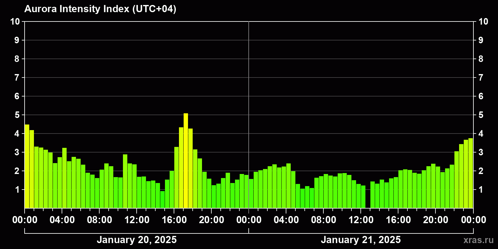 Auroral intensity index and the theoretically possible latitude of observations for nighttime in the Estern Hemisphere as of 2025-01-21 23:47 (end of day) local time