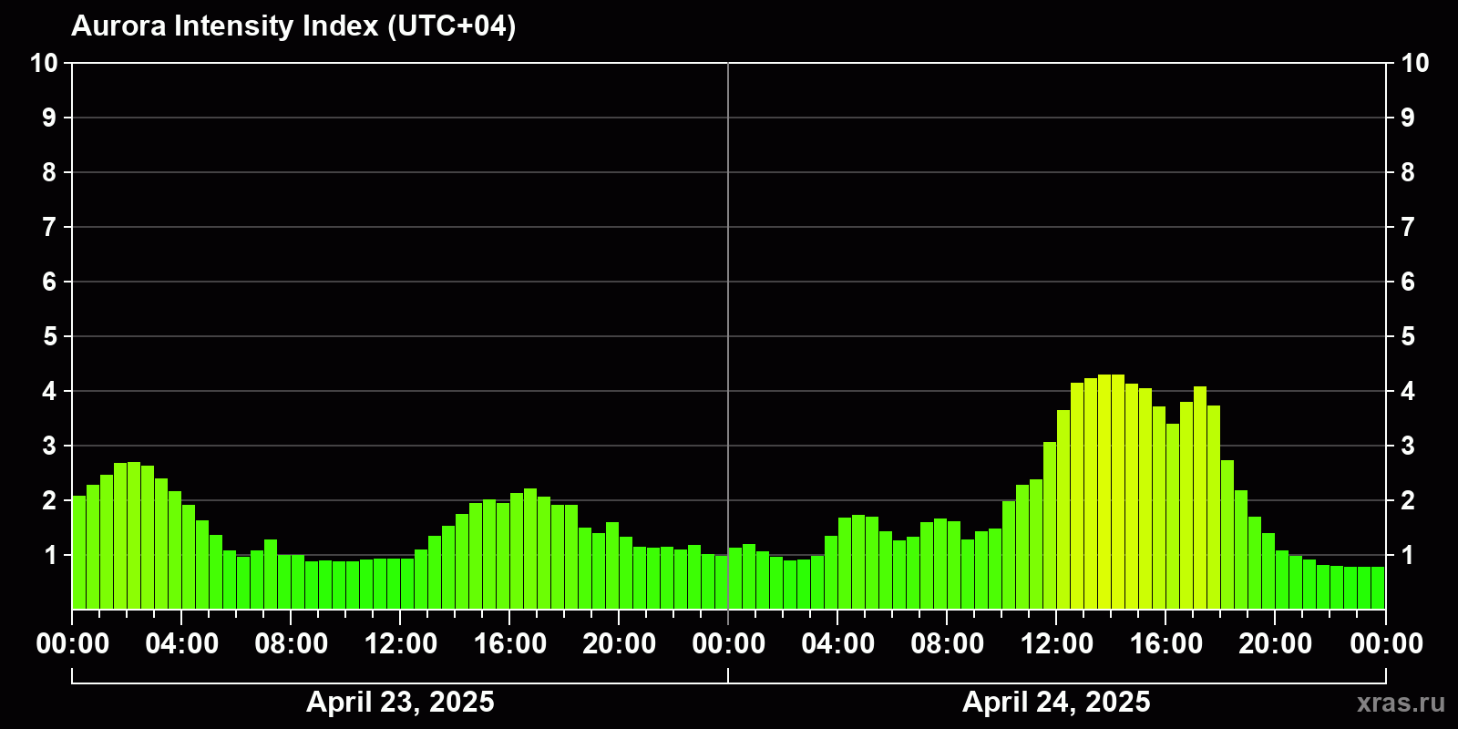 Auroral intensity index and the theoretically possible latitude of observations for nighttime in the Estern Hemisphere as of 2025-04-24 23:52 (end of day) local time