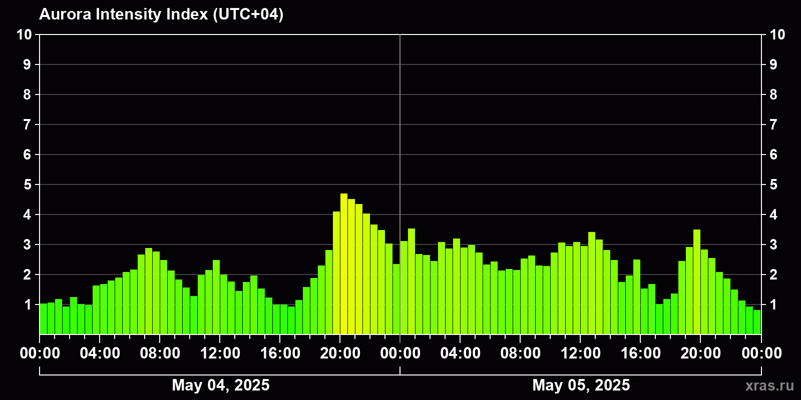 Changes in the auroral intensity index from 2025-05-04 to 2025-05-05 local time