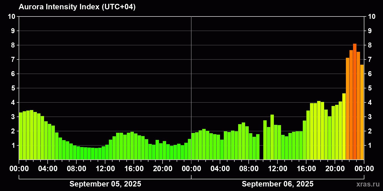Auroral intensity index and the theoretically possible latitude of observations for nighttime in the Estern Hemisphere as of 2025-09-06 23:58 (end of day) local time