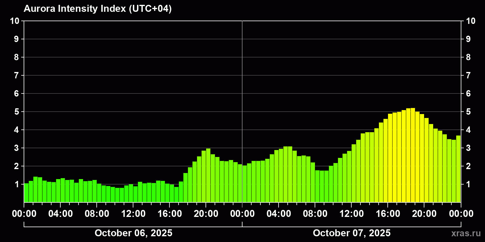 Auroral intensity index and the theoretically possible latitude of observations for nighttime in the Estern Hemisphere as of 2025-10-07 23:53 (end of day) local time