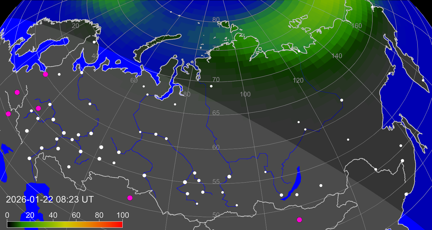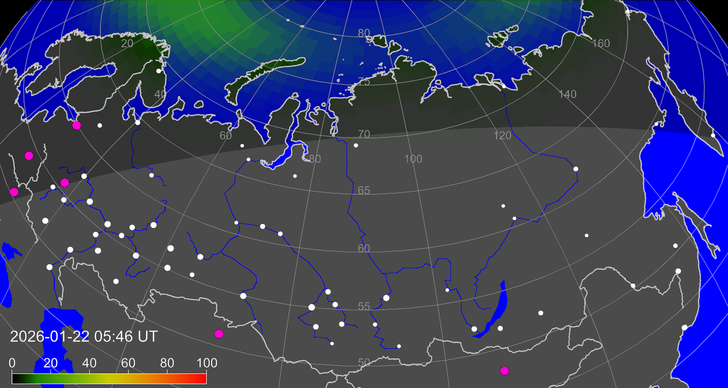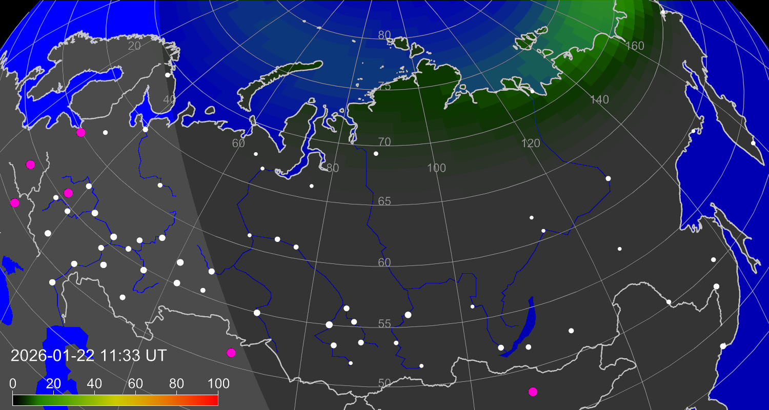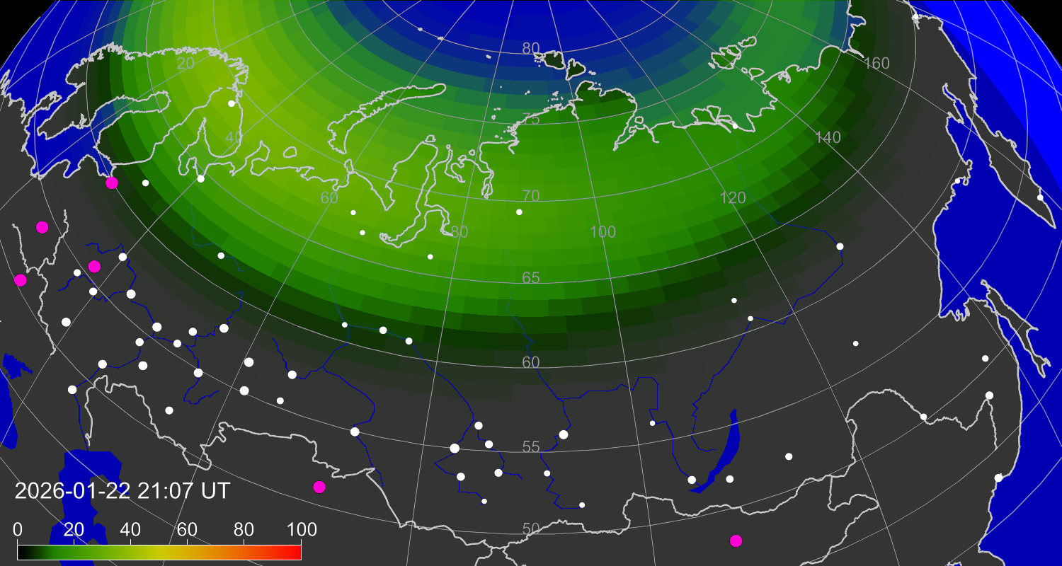 Индекс интенсивности полярных сияний и теоретически возможная широта наблюдений для ночного времени в восточном полушарии