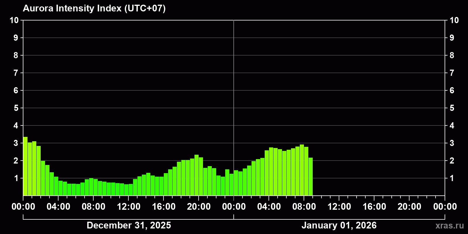 Auroral intensity index and the theoretically possible latitude of observations for nighttime in the Estern Hemisphere as of 2026-01-01 07:15 (end of day) local time