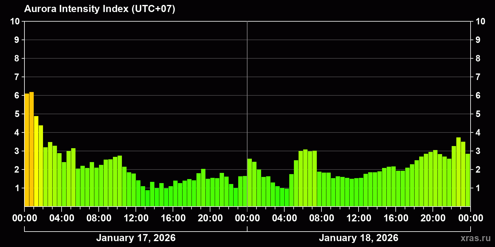 Auroral intensity index and the theoretically possible latitude of observations for nighttime in the Estern Hemisphere as of 2026-01-18 23:45 (end of day) local time