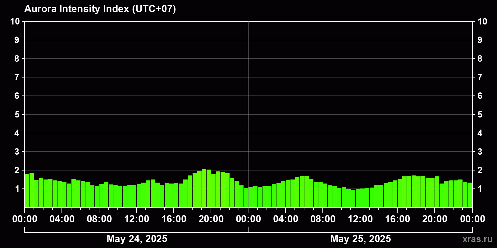 Auroral intensity index and the theoretically possible latitude of observations for nighttime in the Estern Hemisphere as of 2025-05-25 23:58 (end of day) local time