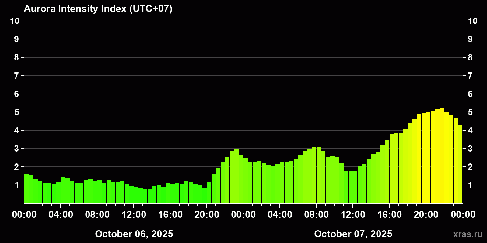 Auroral intensity index and the theoretically possible latitude of observations for nighttime in the Estern Hemisphere as of 2025-10-07 23:49 (end of day) local time