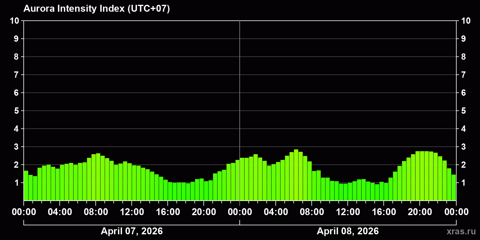 Auroral intensity index and the theoretically possible latitude of observations for nighttime in the Estern Hemisphere as of 2026-04-08 23:57 (end of day) local time