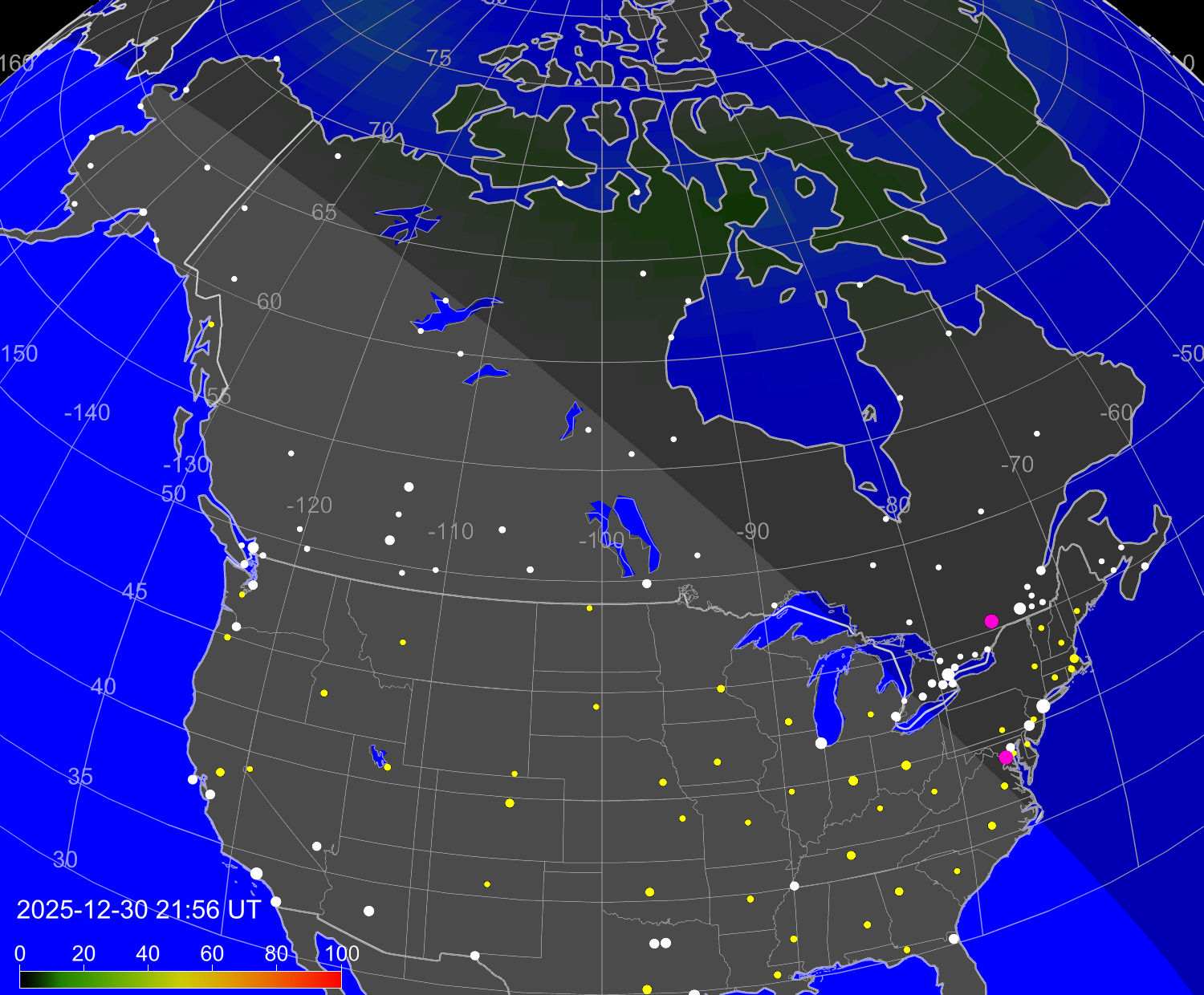 Вероятность полярных сияний в городах США