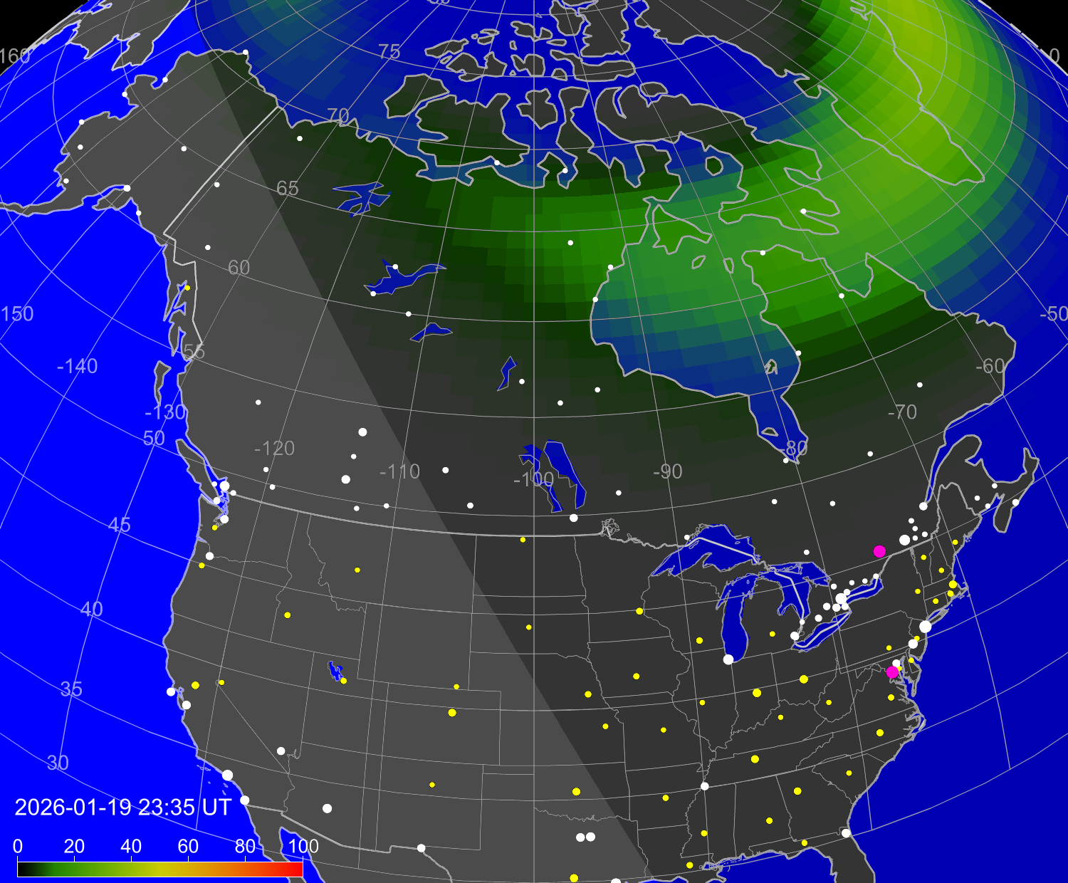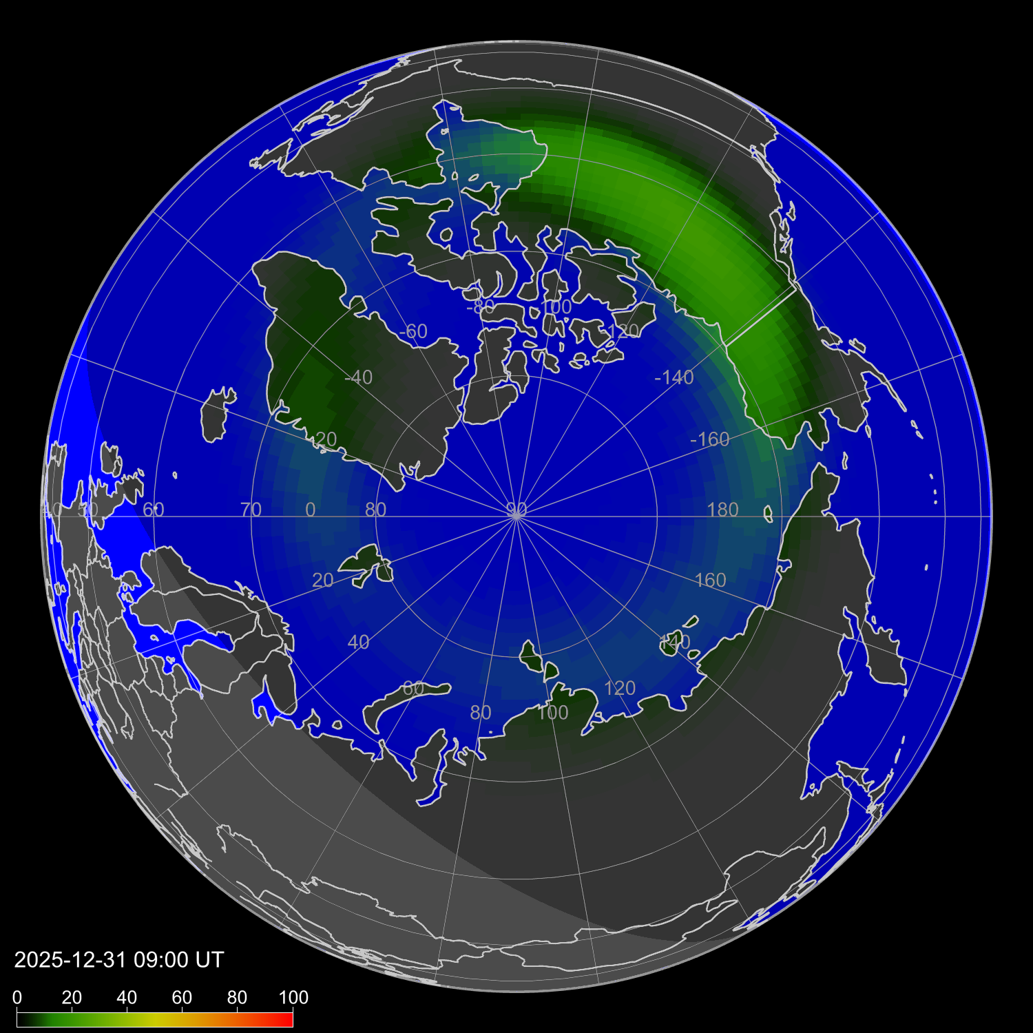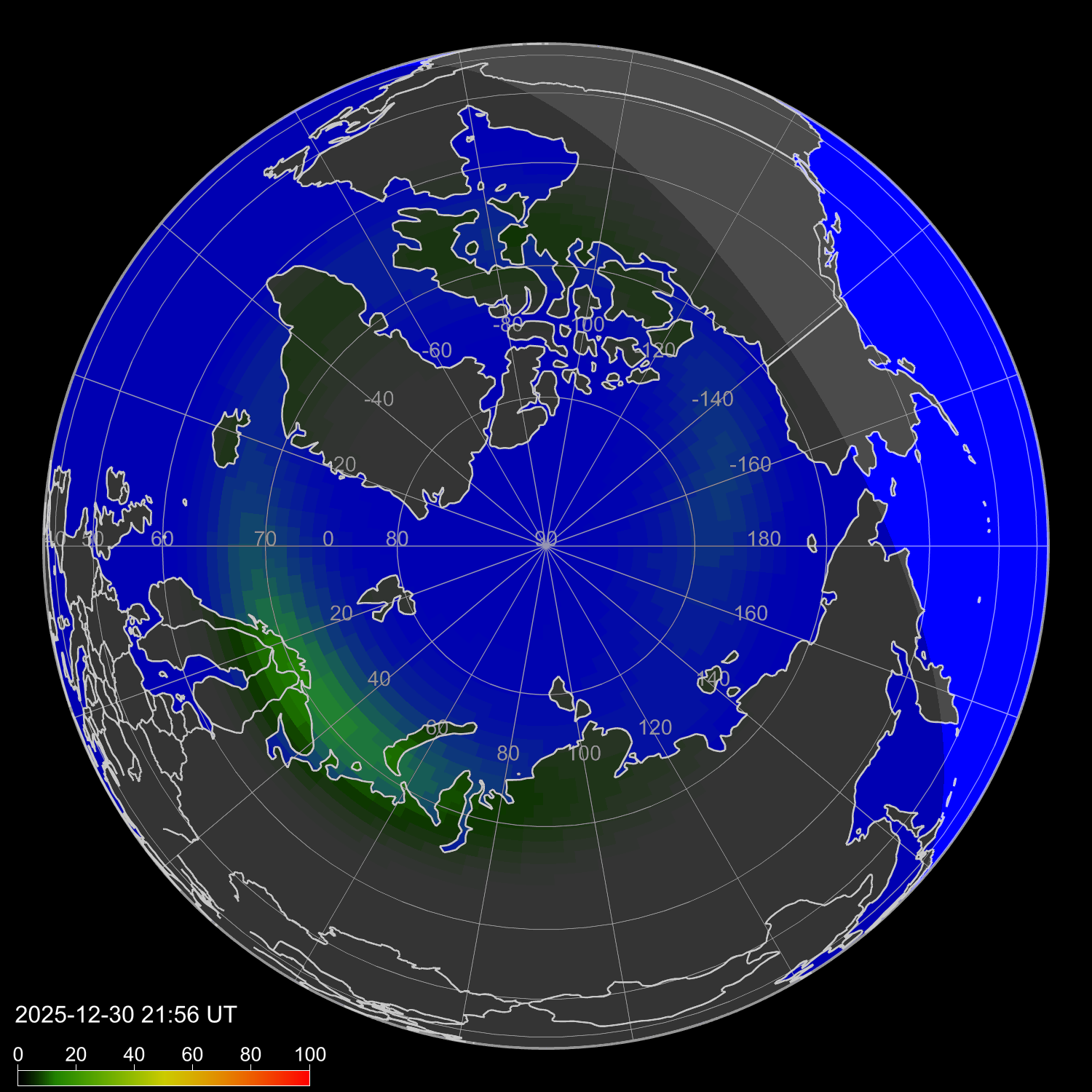 Индекс интенсивности полярных сияний и теоретически возможная широта наблюдений для ночного времени в западном полушарии