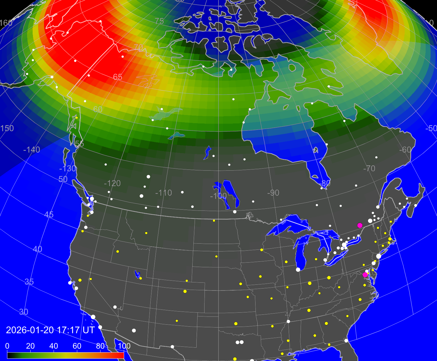 Изменения и часовой прогноз индекса интенсивности полярных сияний с 2026-01-20 по 2026-01-21