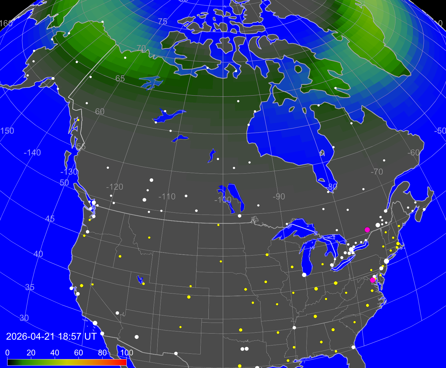 Probability of northern lights (auroras) in cities of United States