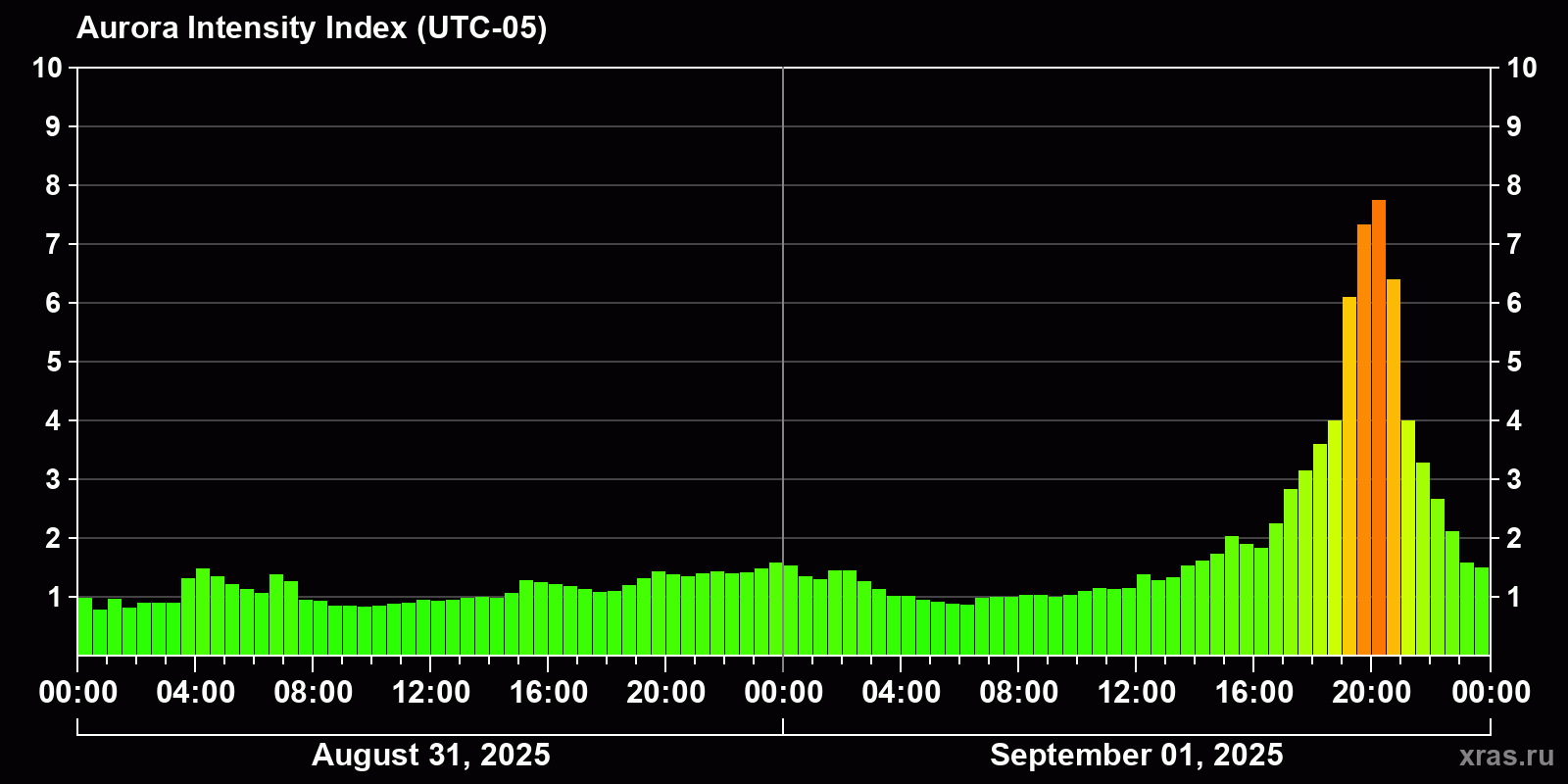 Changes in the auroral intensity index from 2025-08-31 to 2025-09-01 local time