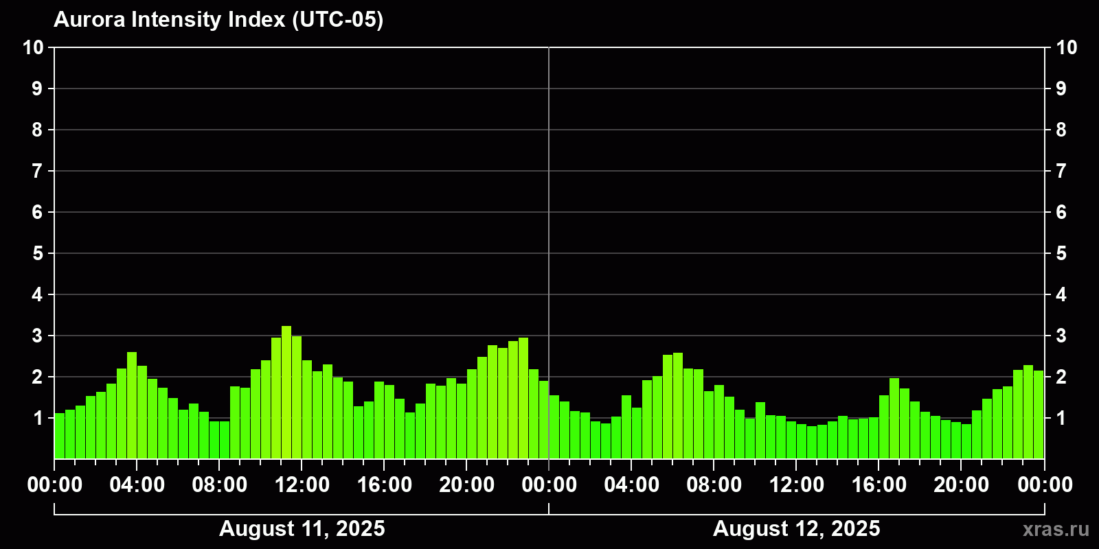 Auroral intensity index and the theoretically possible latitude of observations for nighttime in the Western Hemisphere as of 2025-08-12 23:52 (end of day) local time