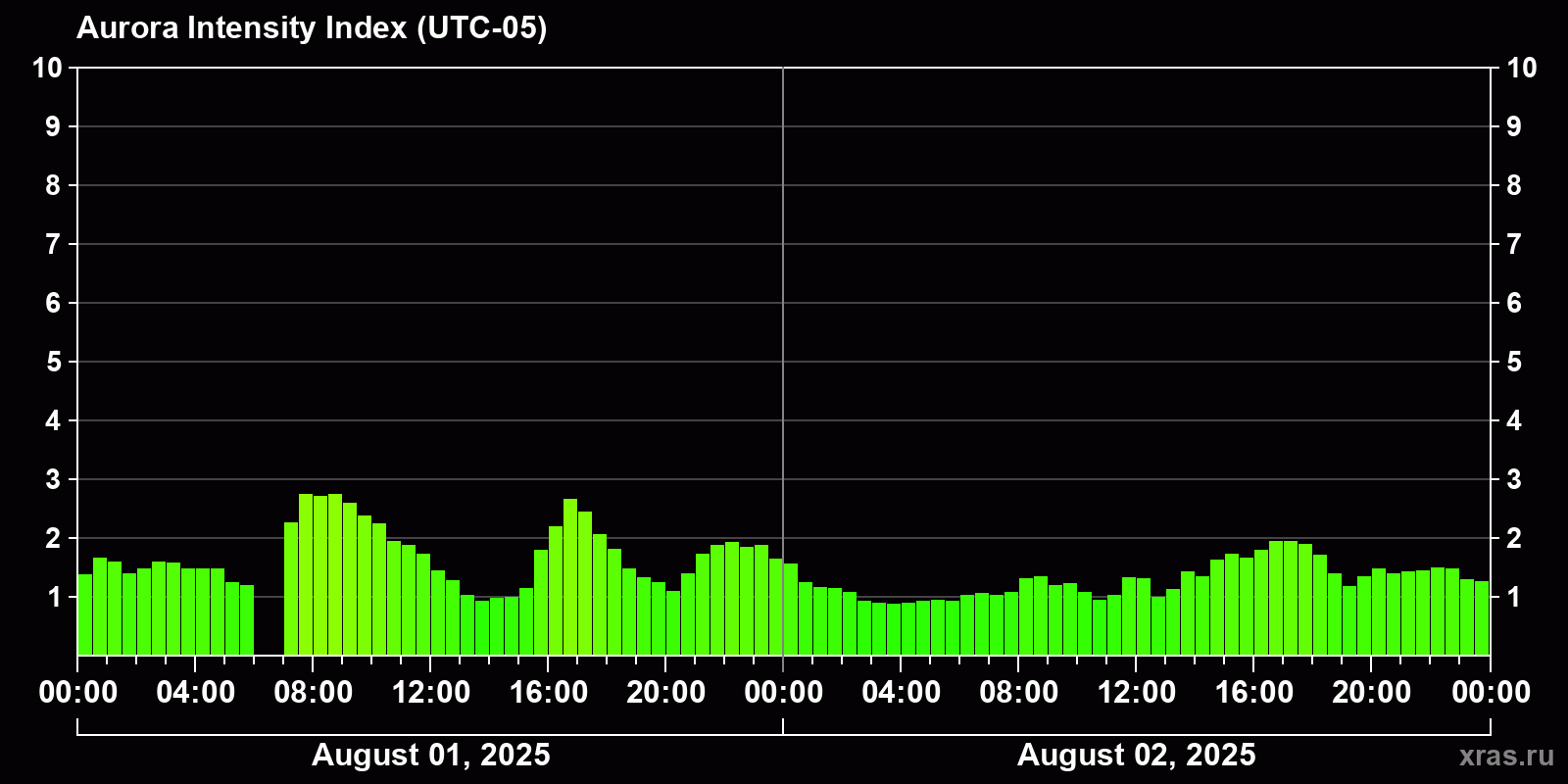 Changes in the auroral intensity index from 2025-08-01 to 2025-08-02 local time