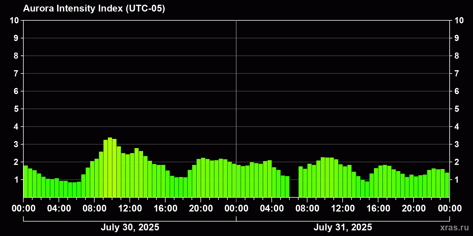 Auroral intensity index and the theoretically possible latitude of observations for nighttime in the Western Hemisphere as of 2025-07-31 23:55 (end of day) local time