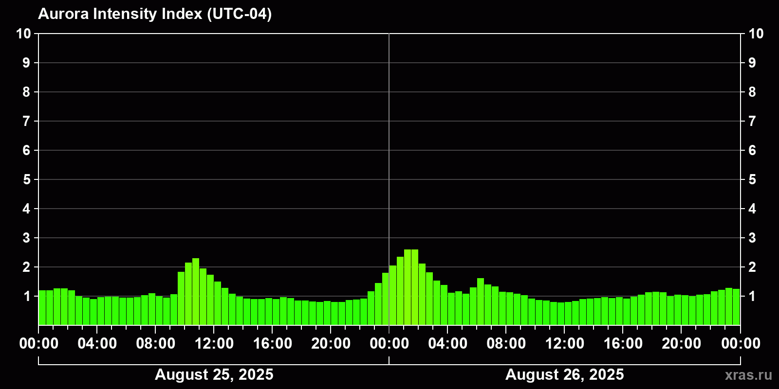 Changes in the auroral intensity index from 2025-08-25 to 2025-08-26 local time
