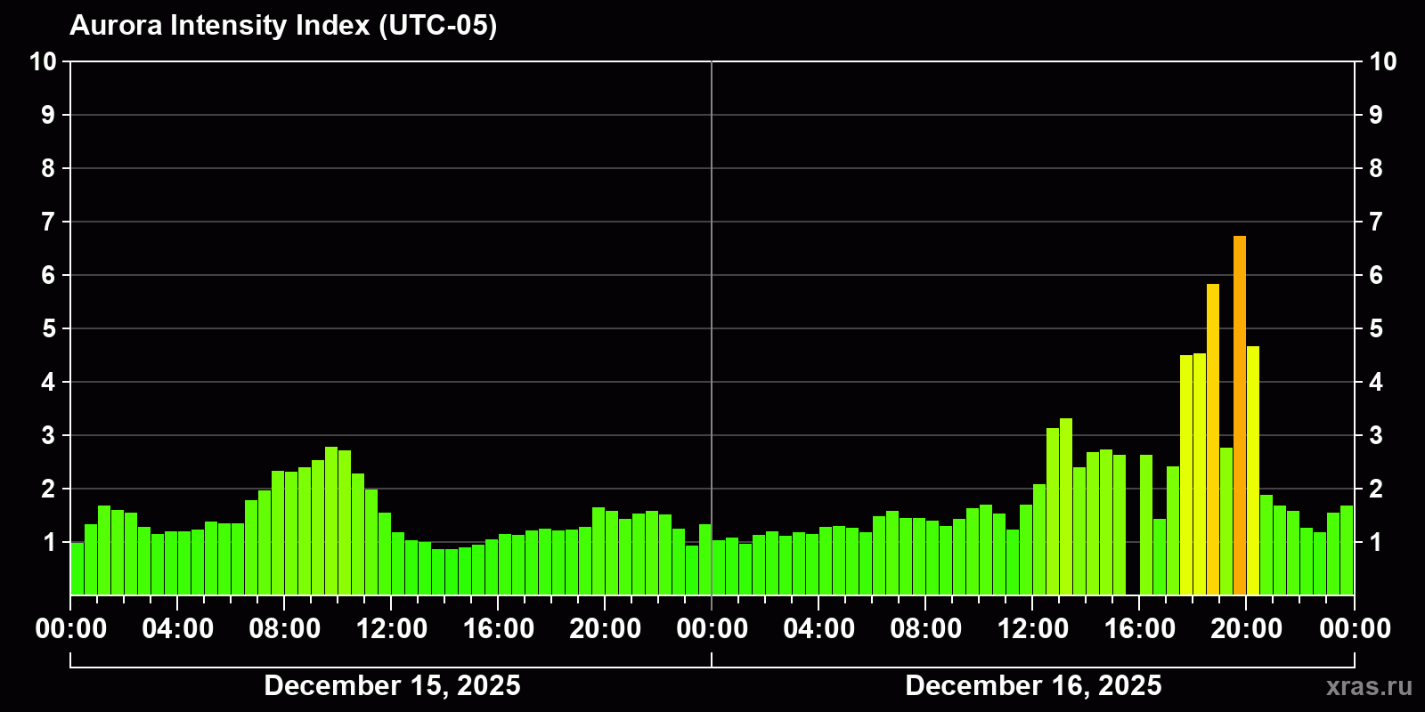 Auroral intensity index and the theoretically possible latitude of observations for nighttime in the Western Hemisphere as of 2025-12-16 23:53 (end of day) local time