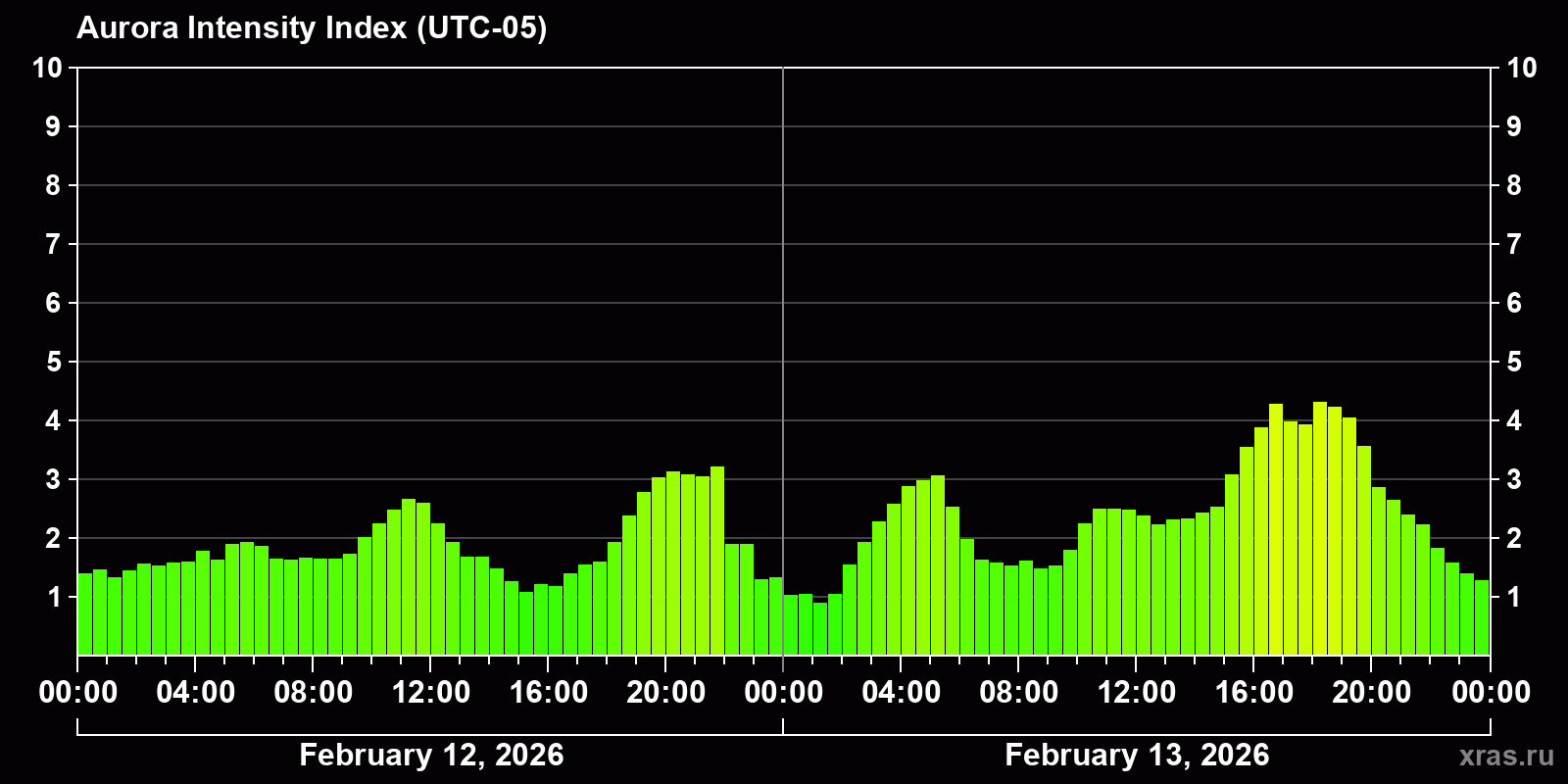 Auroral intensity index and the theoretically possible latitude of observations for nighttime in the Western Hemisphere as of 2026-02-13 23:58 (end of day) local time