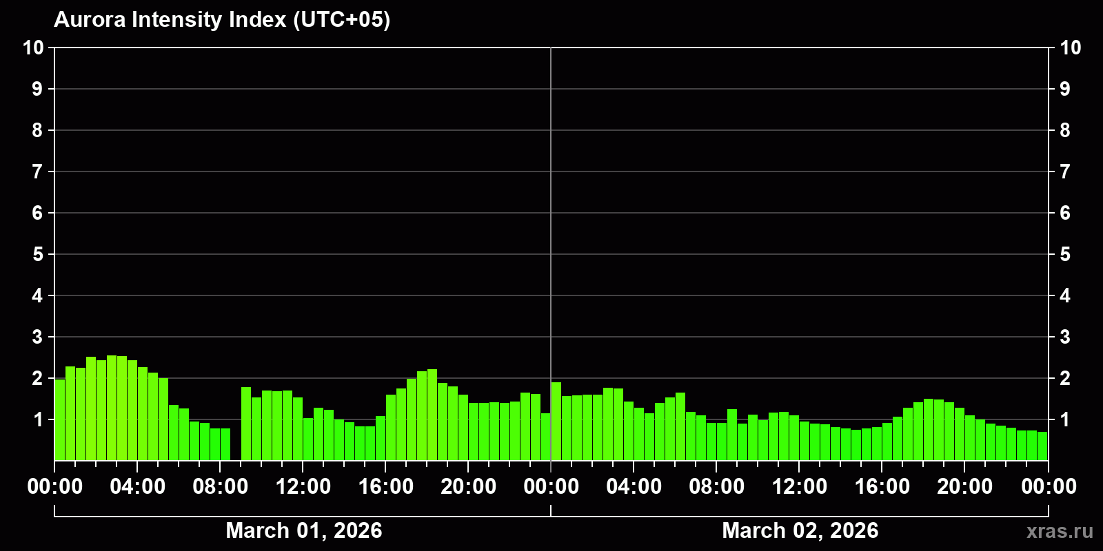 Changes in the auroral intensity index from 2026-03-01 to 2026-03-02 local time