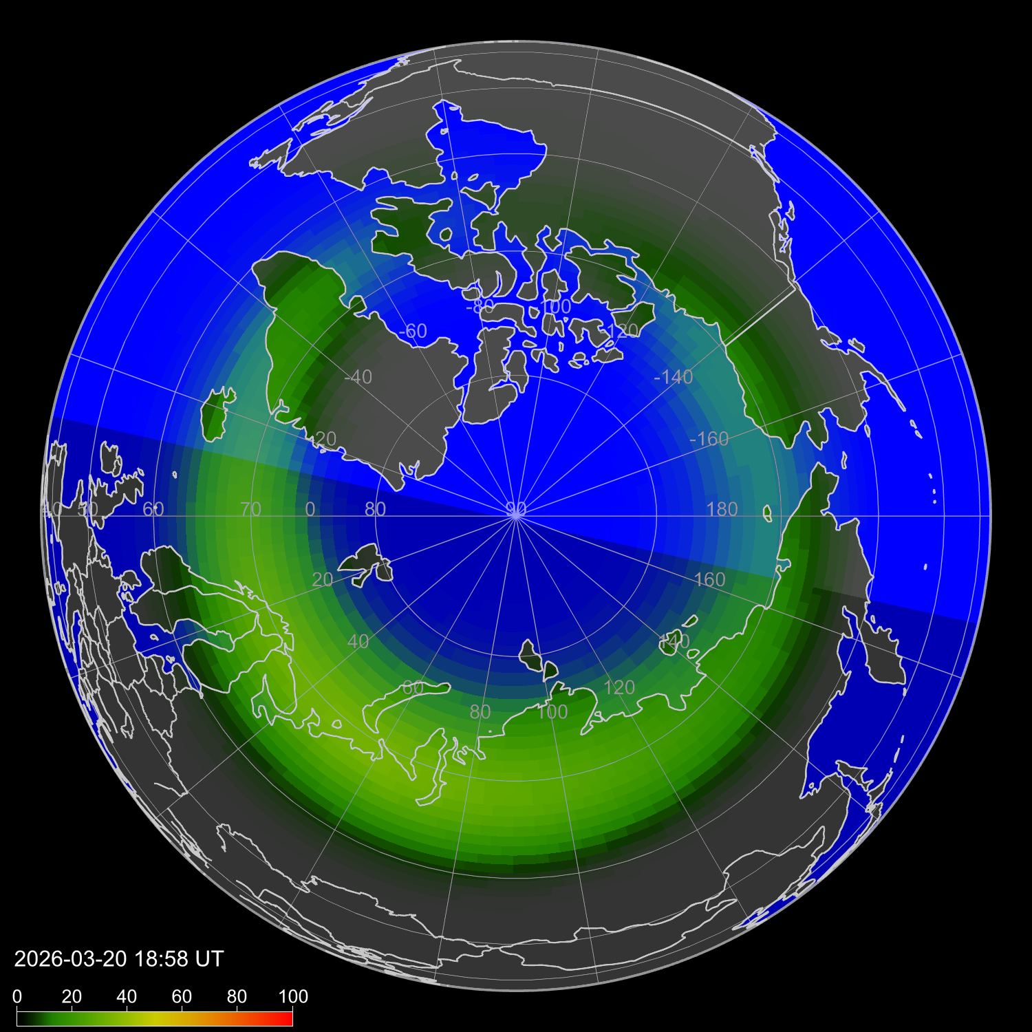 Изменения и часовой прогноз индекса интенсивности полярных сияний с 2026-03-18 по 2026-03-19