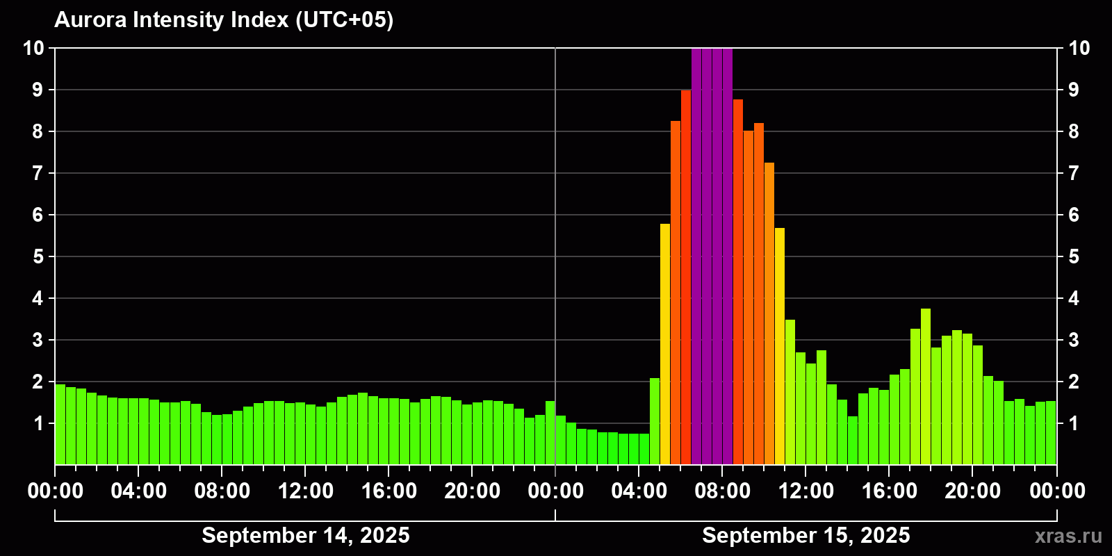 Changes in the auroral intensity index from 2025-09-14 to 2025-09-15 local time
