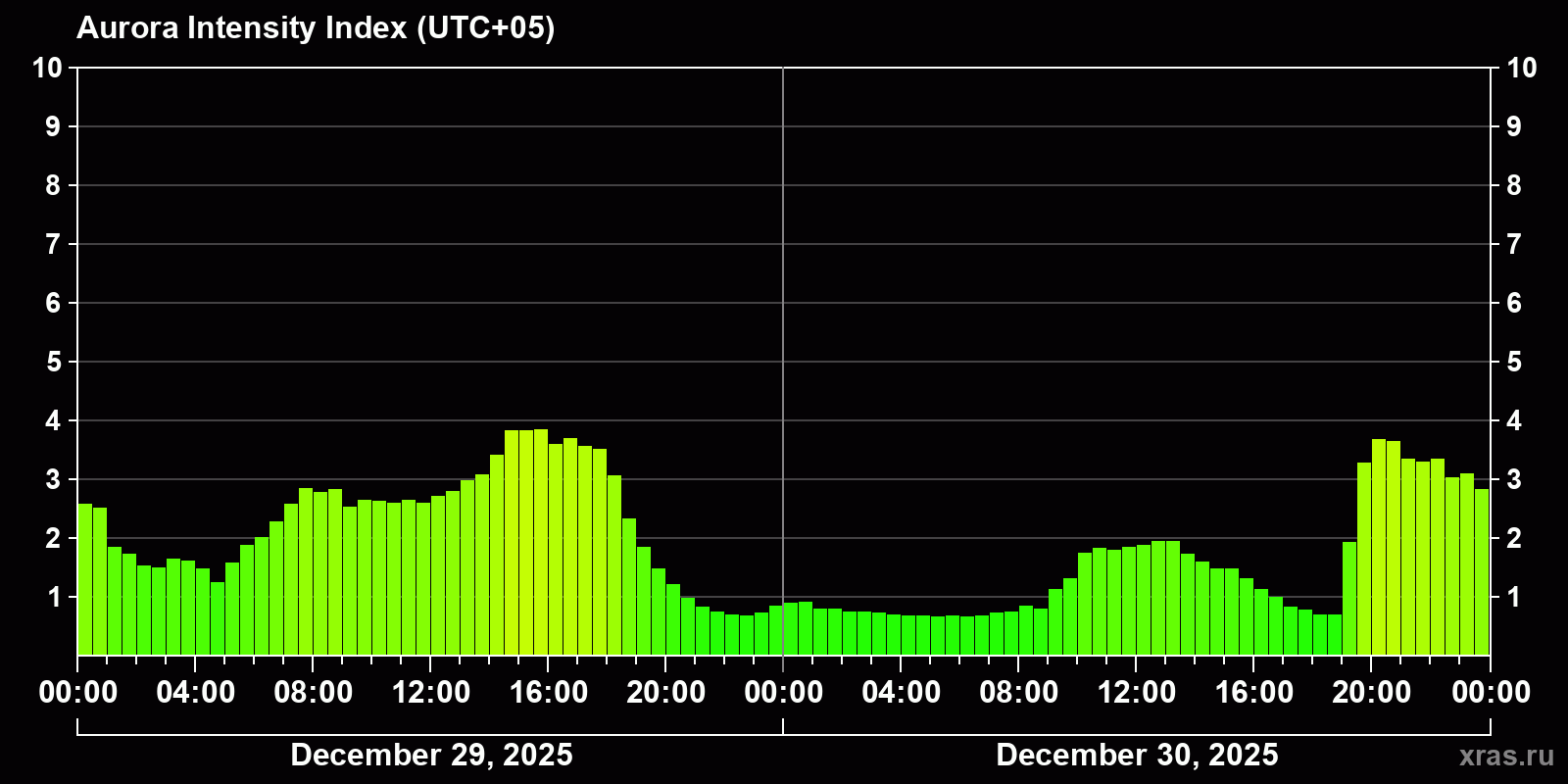 Auroral intensity index and the theoretically possible latitude of observations for nighttime in the Estern Hemisphere as of 2025-12-30 23:50 (end of day) local time