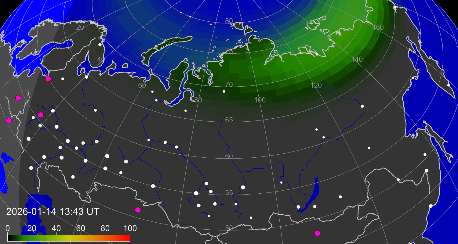 Вероятность полярных сияний в городах Российской Федерации