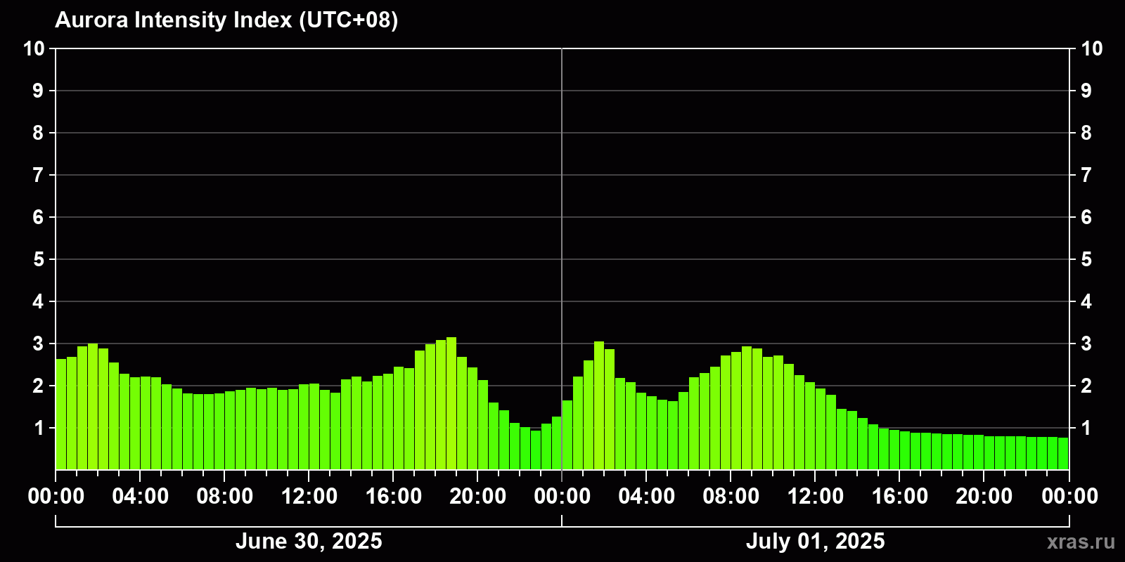 Auroral intensity index and the theoretically possible latitude of observations for nighttime in the Estern Hemisphere as of 2025-07-01 23:51 (end of day) local time