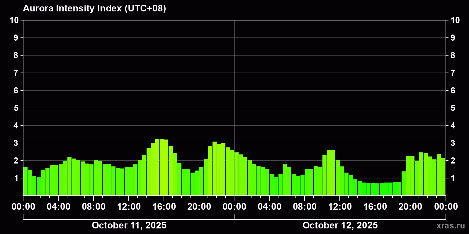 Changes in the auroral intensity index from 2025-10-11 to 2025-10-12 local time