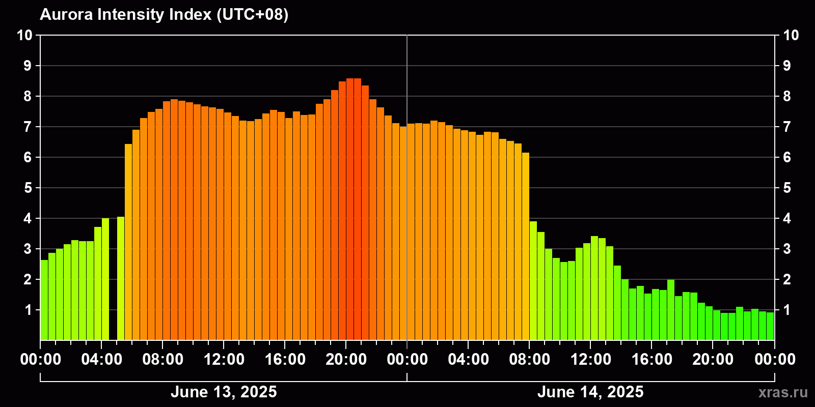 Auroral intensity index and the theoretically possible latitude of observations for nighttime in the Estern Hemisphere as of 2025-06-14 23:52 (end of day) local time