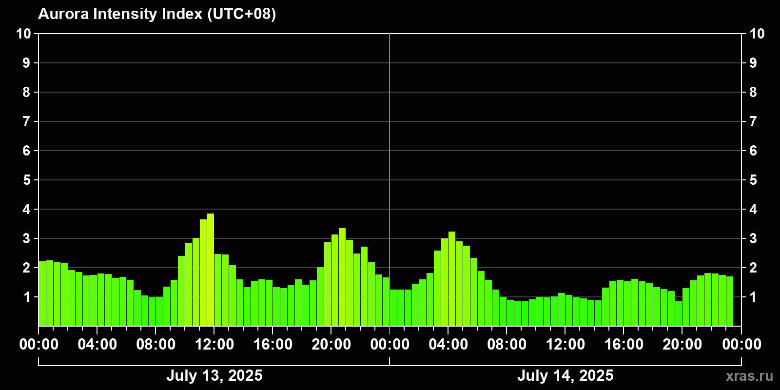 Changes in the auroral intensity index from 2025-07-13 to 2025-07-14 local time