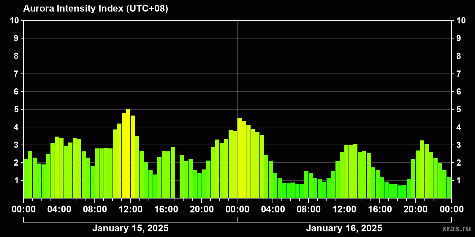 Auroral intensity index and the theoretically possible latitude of observations for nighttime in the Estern Hemisphere as of 2025-01-16 23:54 (end of day) local time