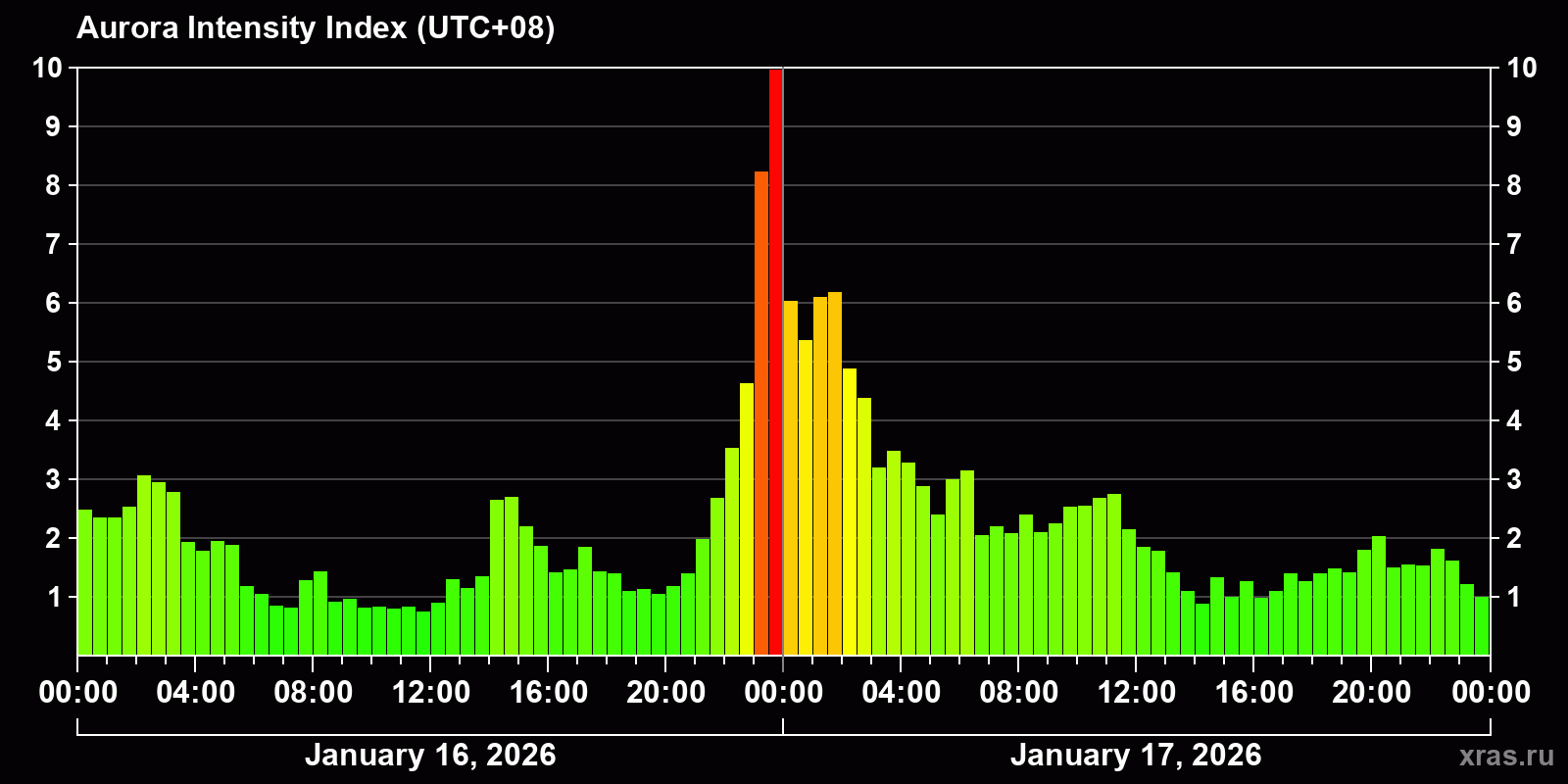 Changes in the auroral intensity index from 2026-01-16 to 2026-01-17 local time