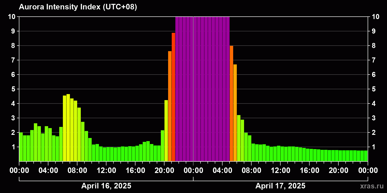 Changes in the auroral intensity index from 2025-04-16 to 2025-04-17 local time
