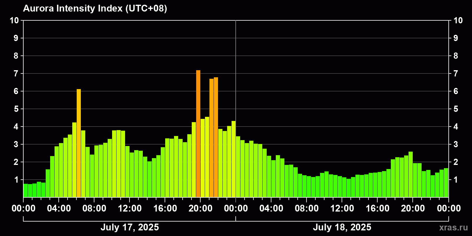 Changes in the auroral intensity index from 2025-07-17 to 2025-07-18 local time