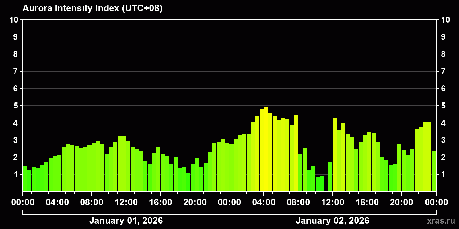 Auroral intensity index and the theoretically possible latitude of observations for nighttime in the Estern Hemisphere as of 2026-01-02 23:48 (end of day) local time