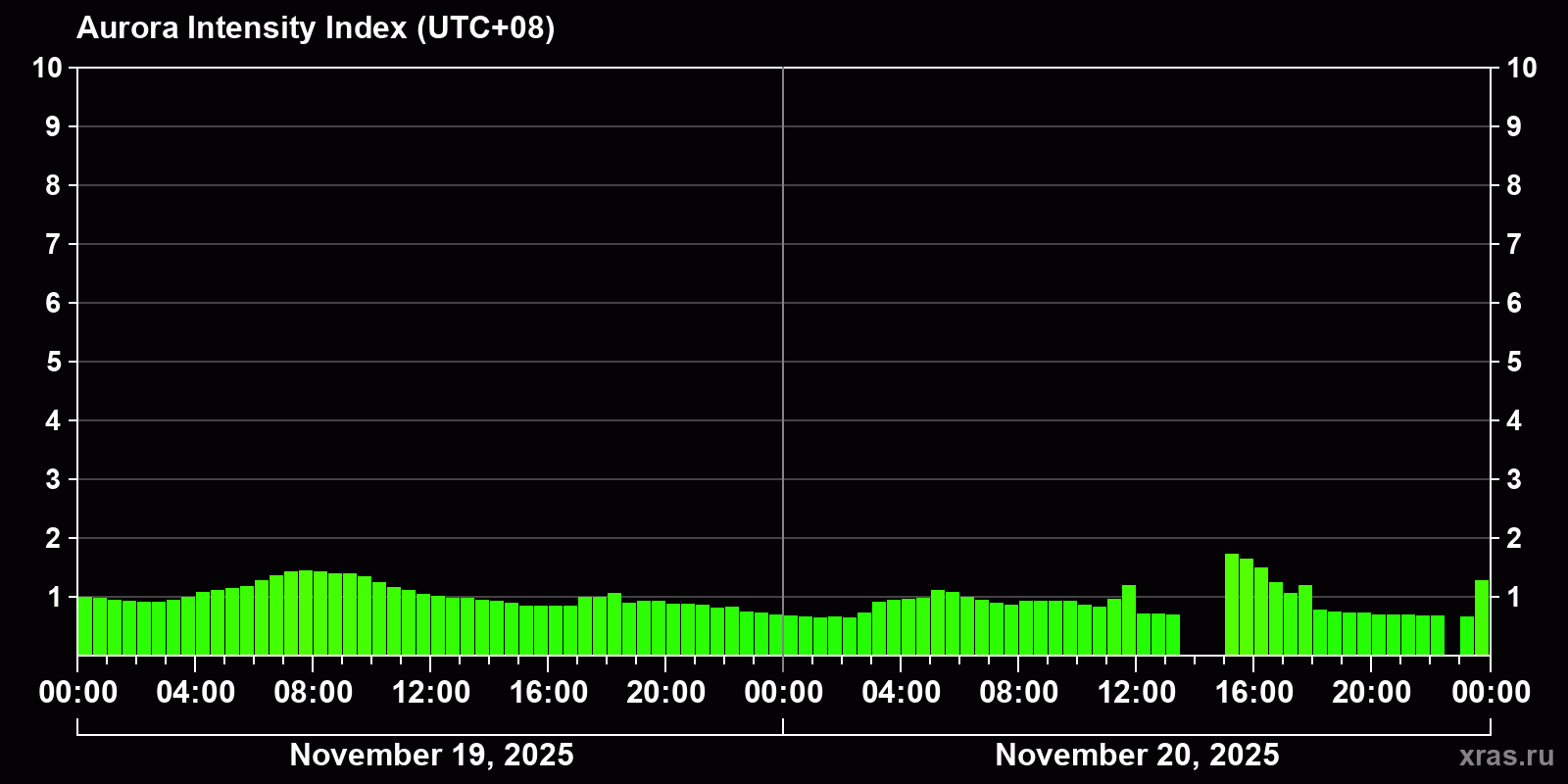 Changes in the auroral intensity index from 2025-11-19 to 2025-11-20 local time
