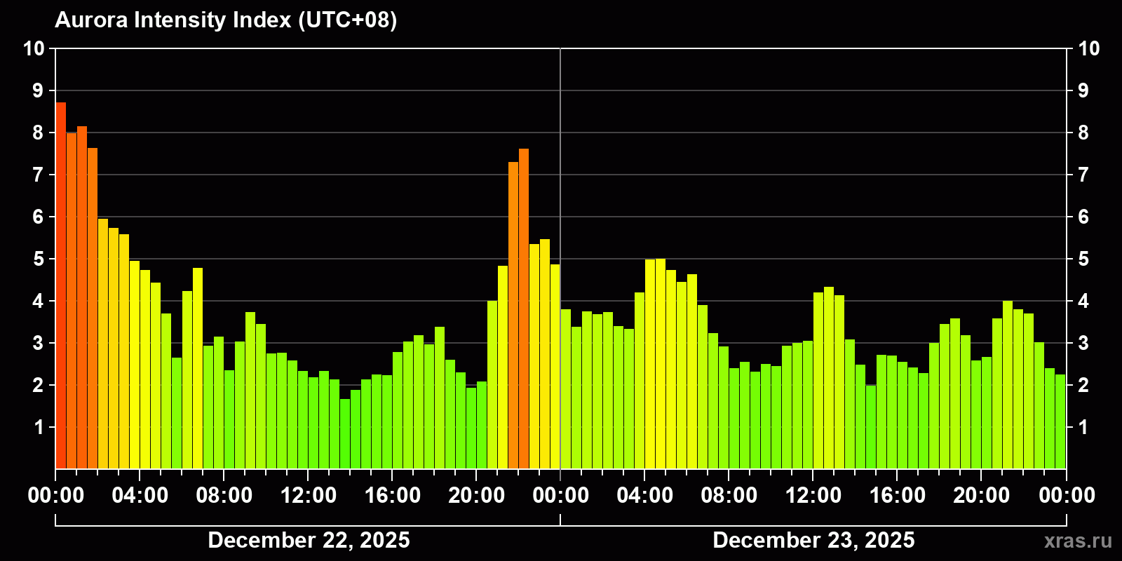 Auroral intensity index and the theoretically possible latitude of observations for nighttime in the Estern Hemisphere as of 2025-12-23 23:50 (end of day) local time
