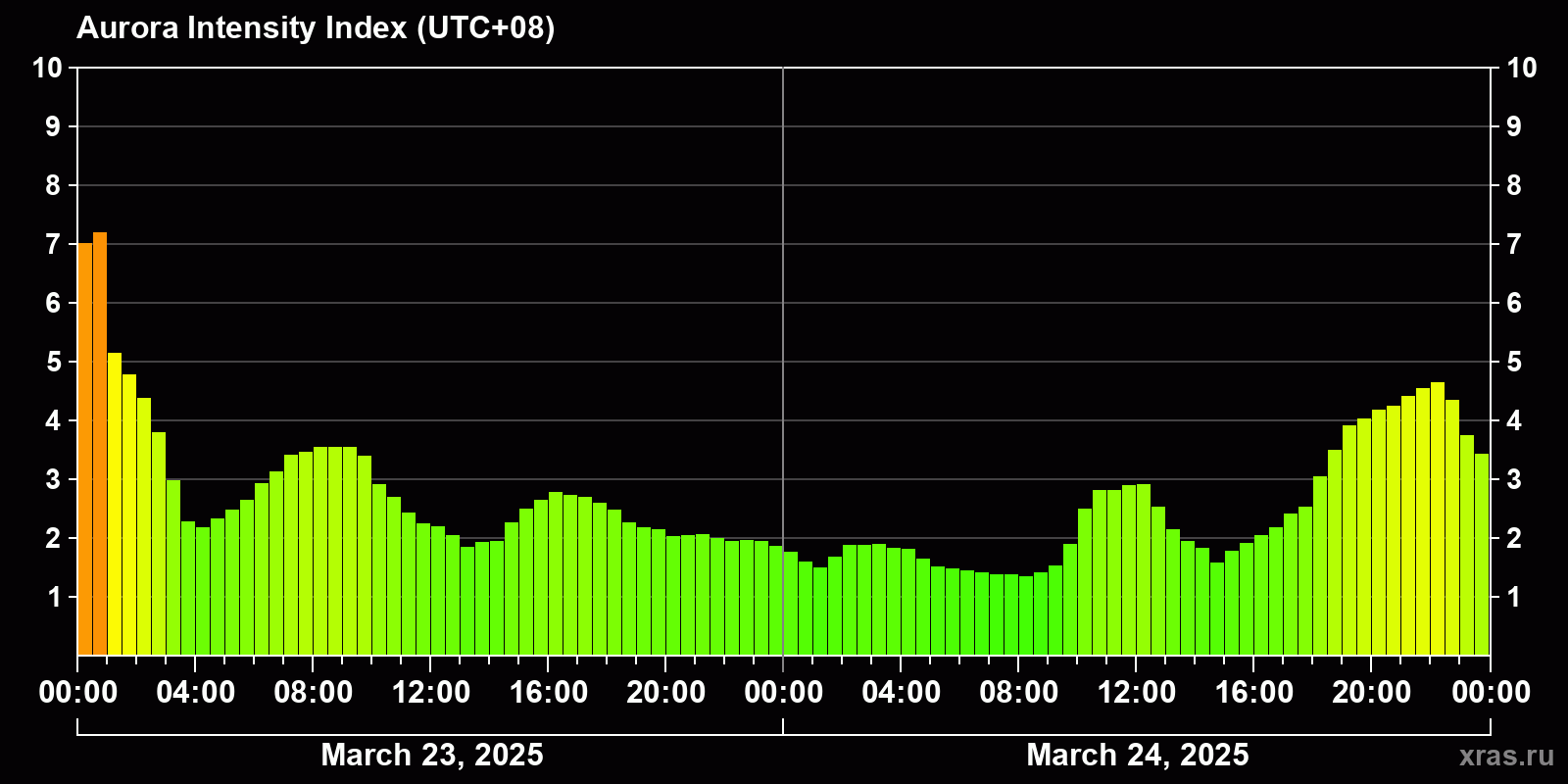 Auroral intensity index and the theoretically possible latitude of observations for nighttime in the Estern Hemisphere as of 2025-03-24 23:44 (end of day) local time