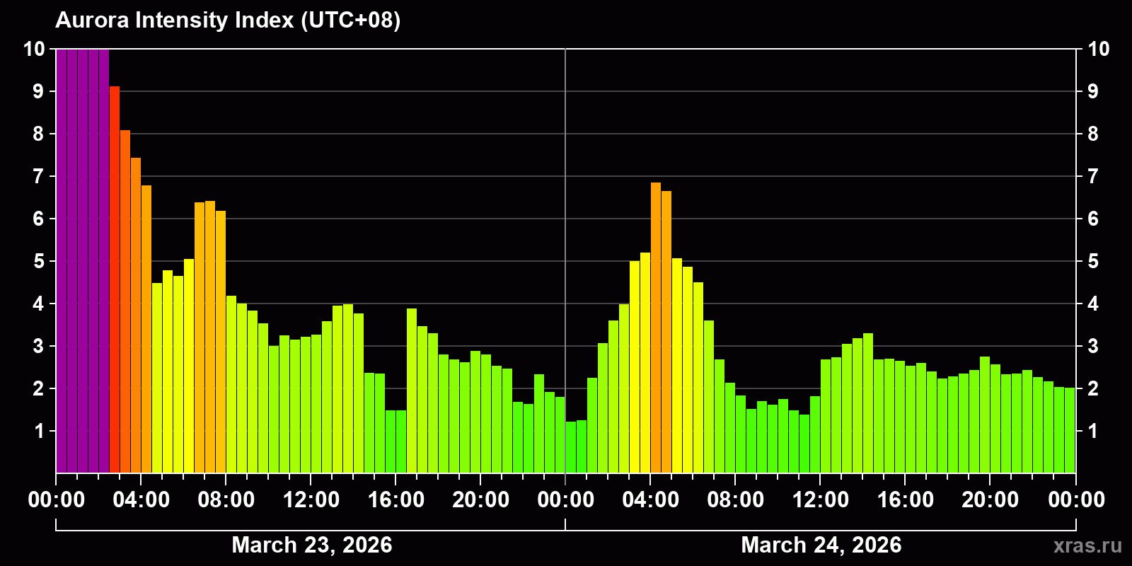 Auroral intensity index and the theoretically possible latitude of observations for nighttime in the Estern Hemisphere as of 2026-03-24 23:57 (end of day) local time