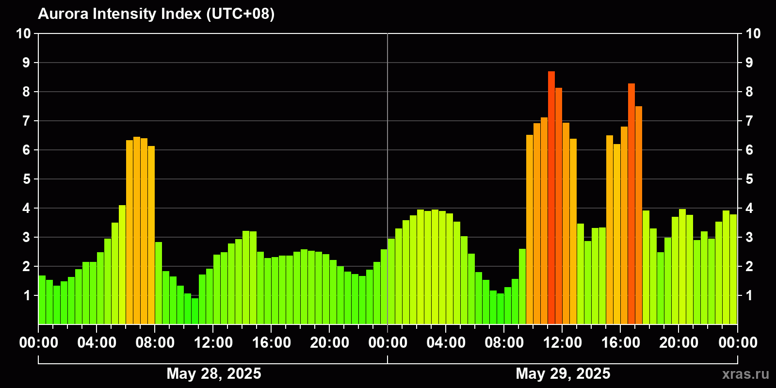 Changes in the auroral intensity index from 2025-05-28 to 2025-05-29 local time