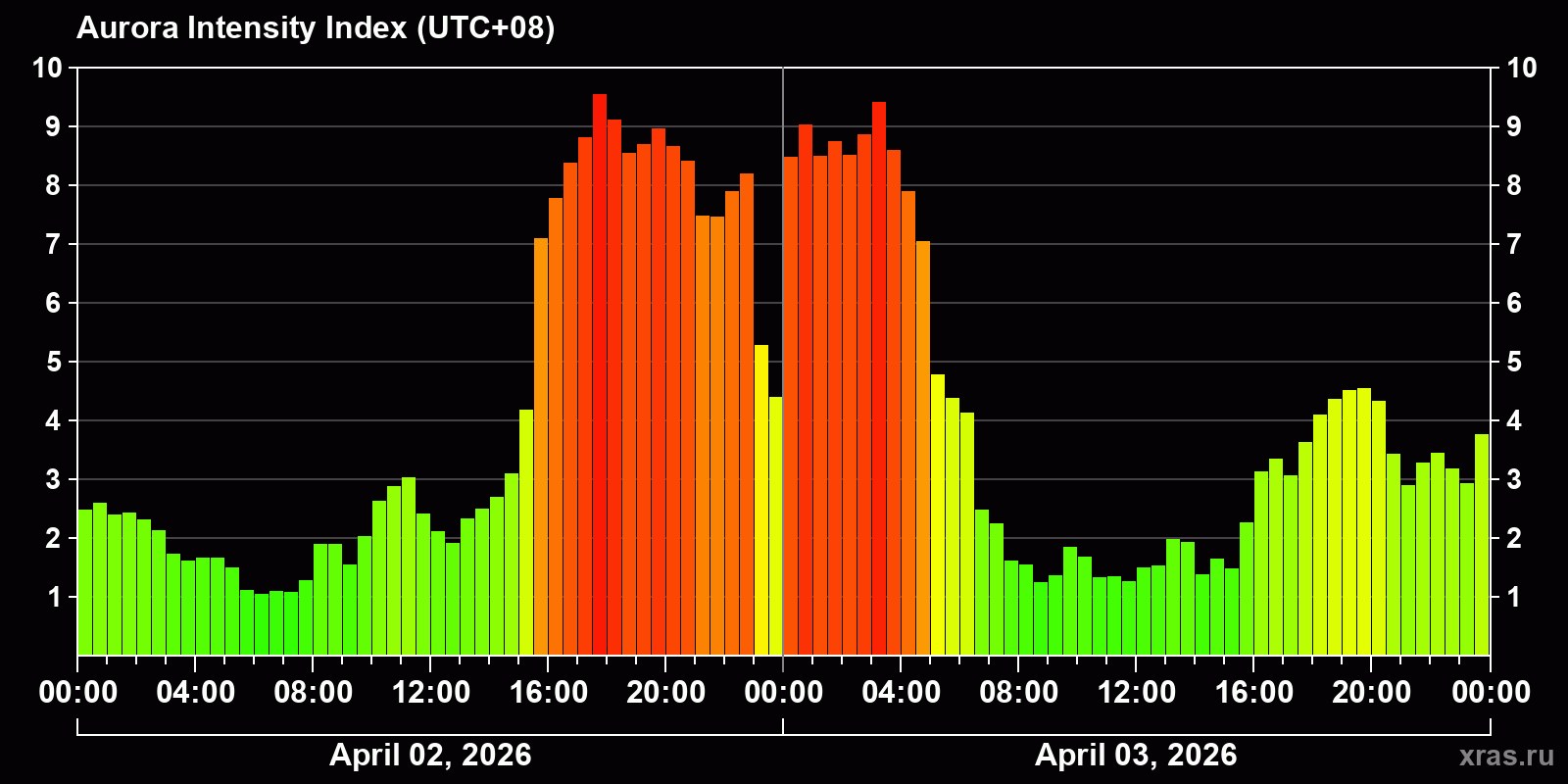 Changes in the auroral intensity index from 2026-04-02 to 2026-04-03 local time