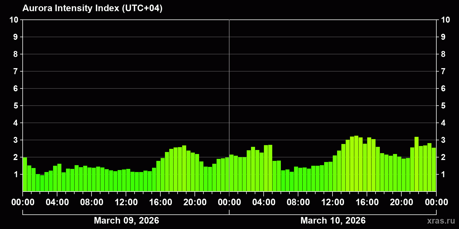 Auroral intensity index and the theoretically possible latitude of observations for nighttime in the Estern Hemisphere as of 2026-03-10 23:45 (end of day) local time