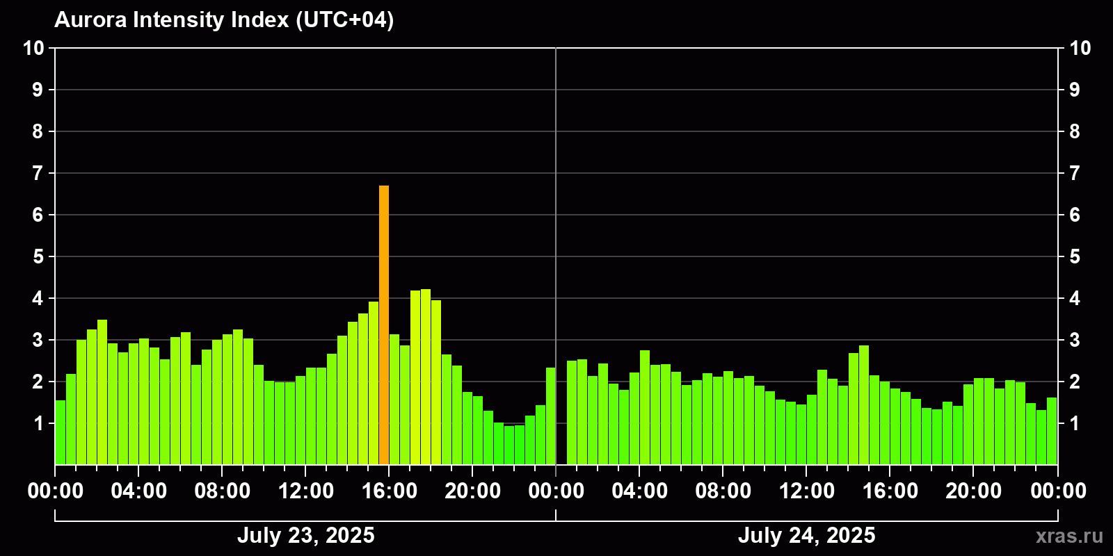 Auroral intensity index and the theoretically possible latitude of observations for nighttime in the Estern Hemisphere as of 2025-07-24 23:51 (end of day) local time
