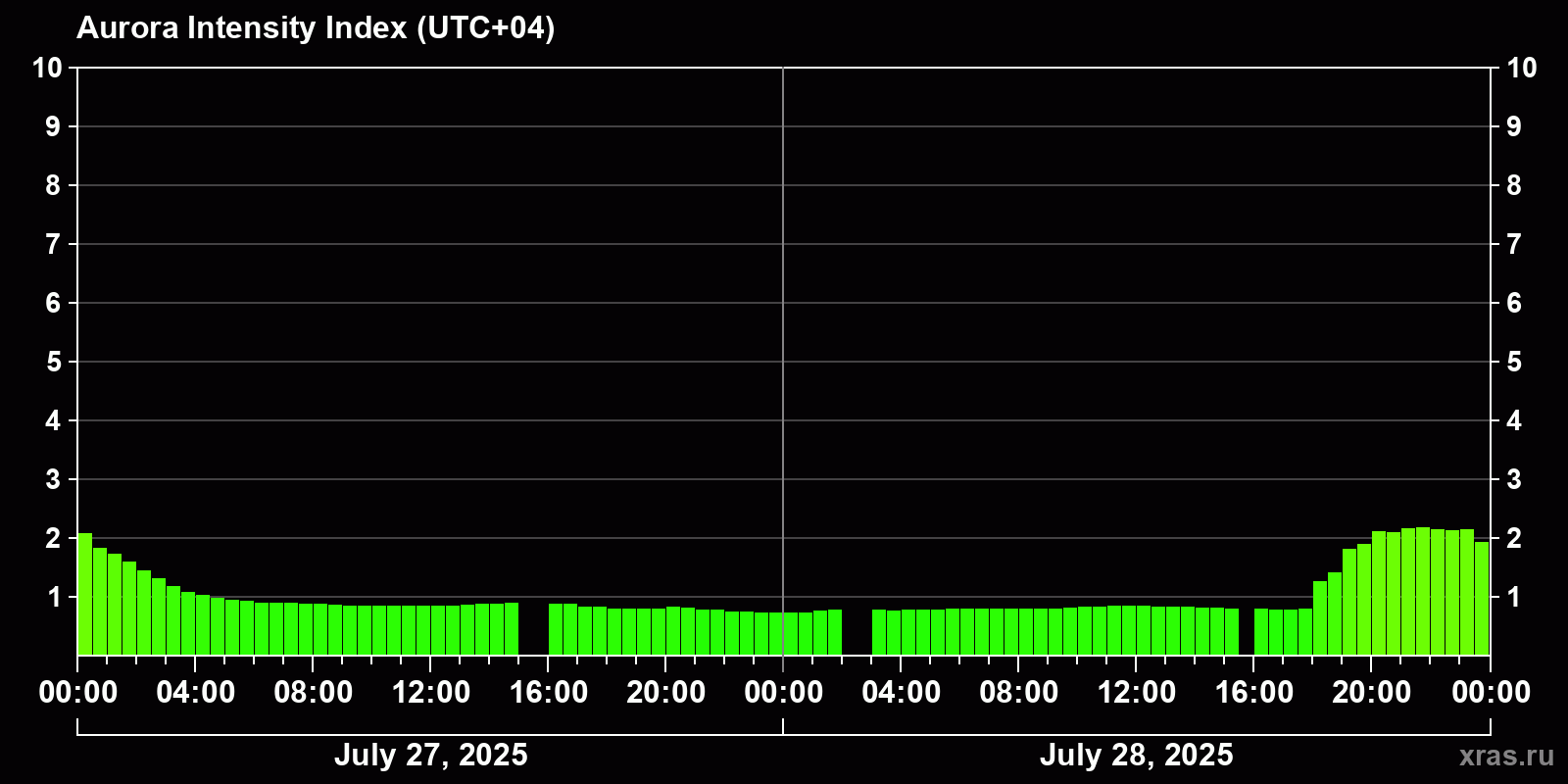 Auroral intensity index and the theoretically possible latitude of observations for nighttime in the Estern Hemisphere as of 2025-07-28 23:50 (end of day) local time
