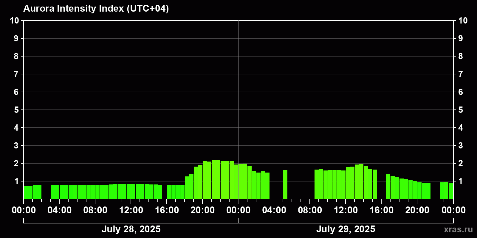Auroral intensity index and the theoretically possible latitude of observations for nighttime in the Estern Hemisphere as of 2025-07-29 23:44 (end of day) local time
