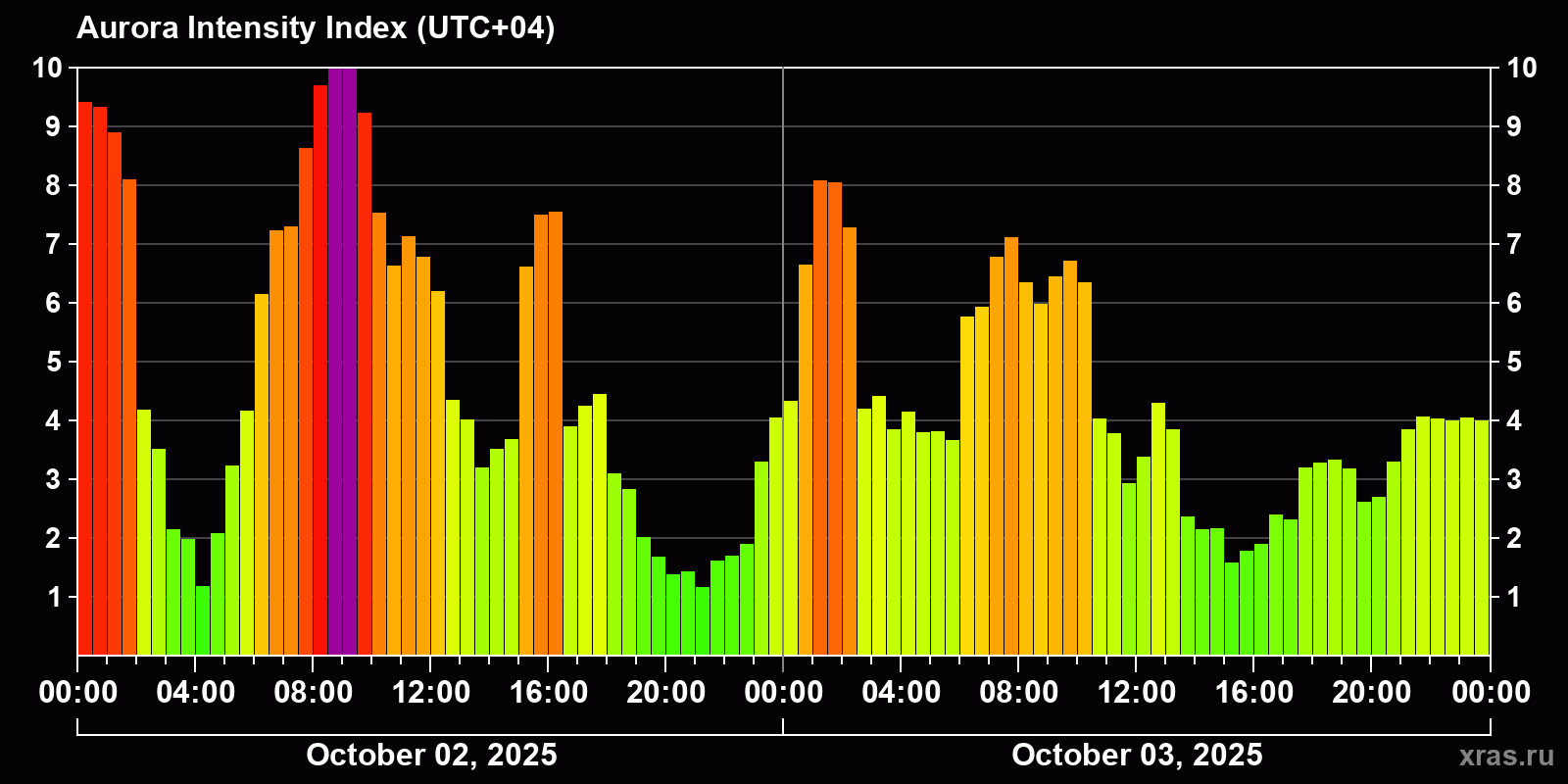 Auroral intensity index and the theoretically possible latitude of observations for nighttime in the Estern Hemisphere as of 2025-10-03 23:51 (end of day) local time