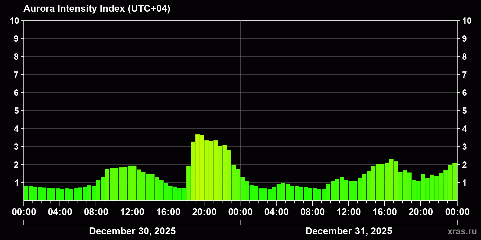 Auroral intensity index and the theoretically possible latitude of observations for nighttime in the Estern Hemisphere as of 2025-12-31 23:57 (end of day) local time
