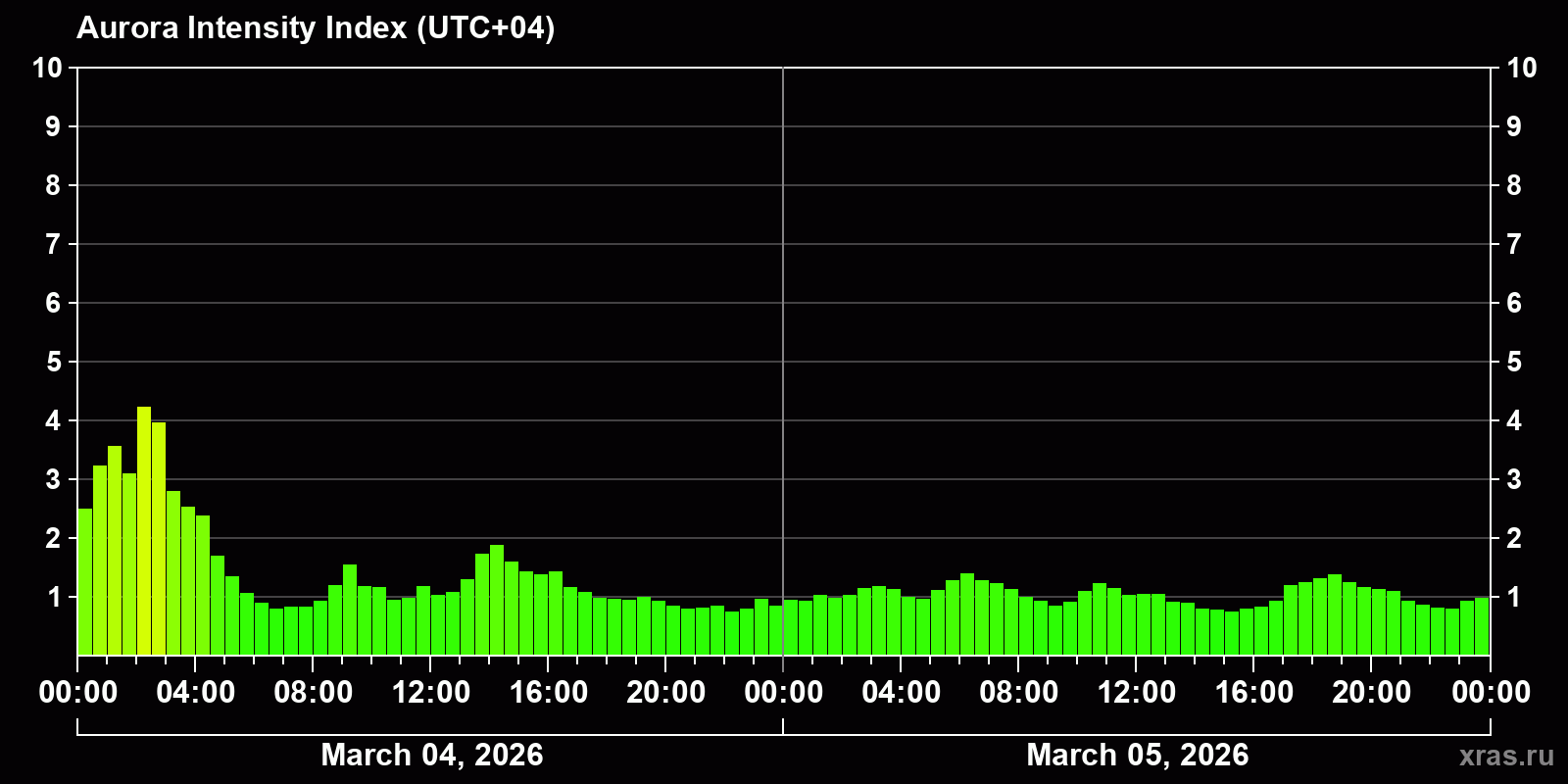 Changes in the auroral intensity index from 2026-03-04 to 2026-03-05 local time